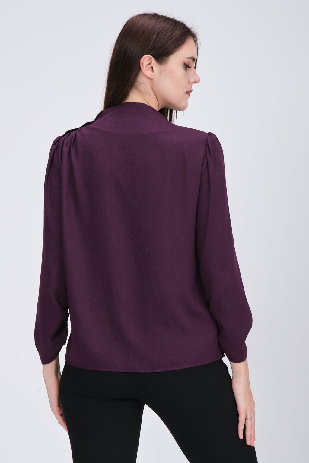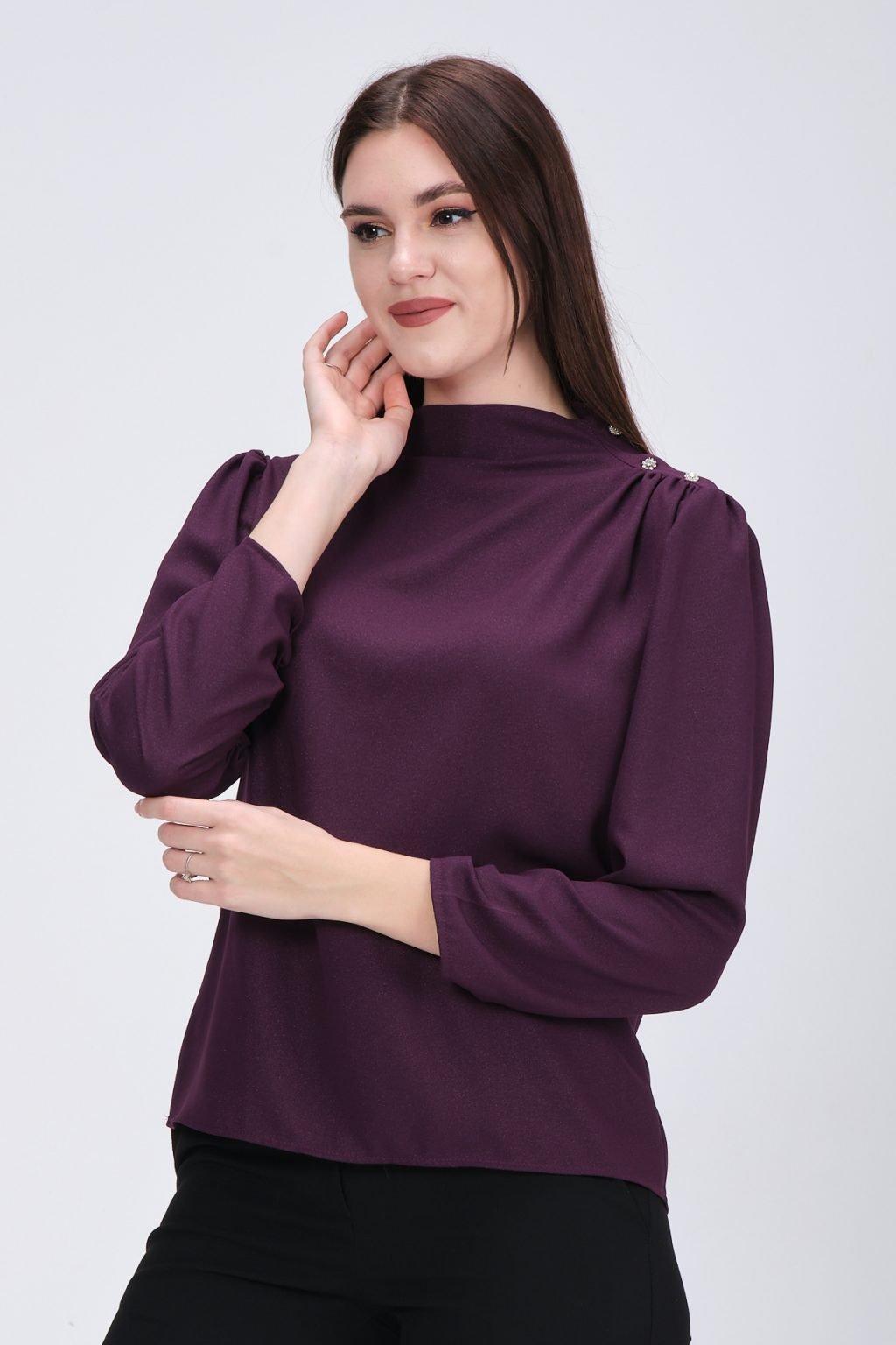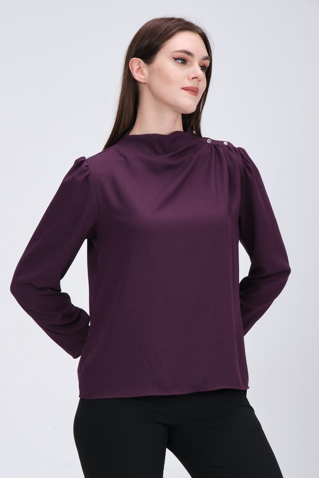 - Chemisier élégant avec encolure ronde, manches longues, cordon de serrage en haut des manches, poignets sur la manche et détails en pierre collée brillante sur le devant