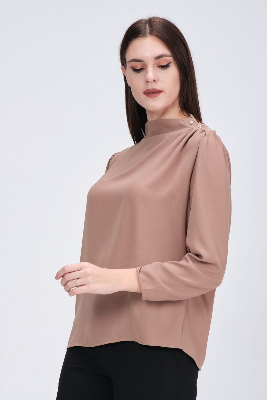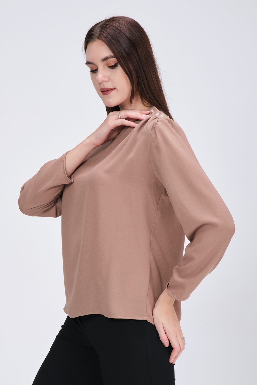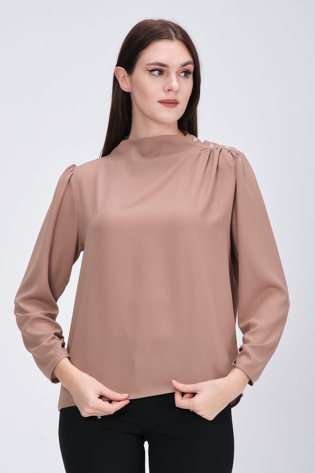 - Chemisier élégant avec encolure ronde, manches longues, cordon de serrage en haut des manches, poignets sur la manche et détails en pierre collée brillante sur le devant